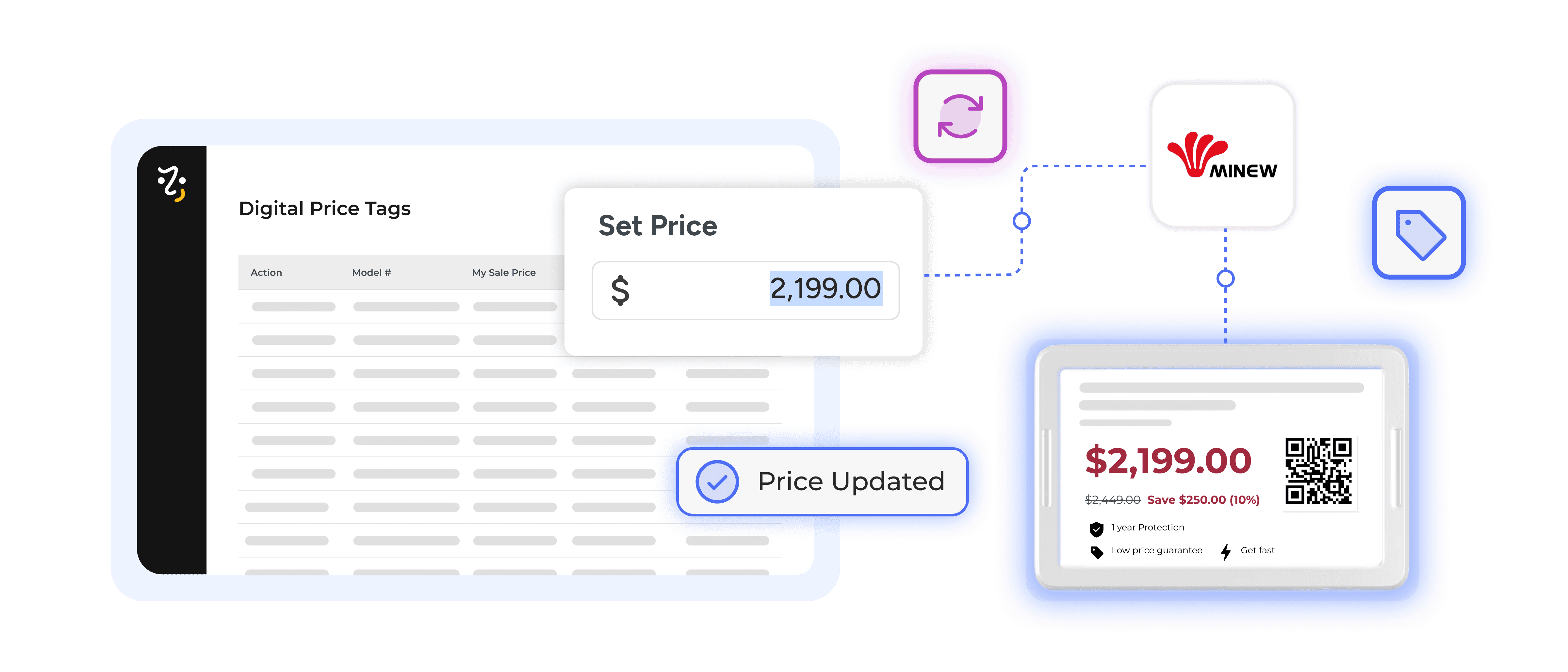 Model numbers, pricing, and relevant product details display directly on Minew digital tags.
